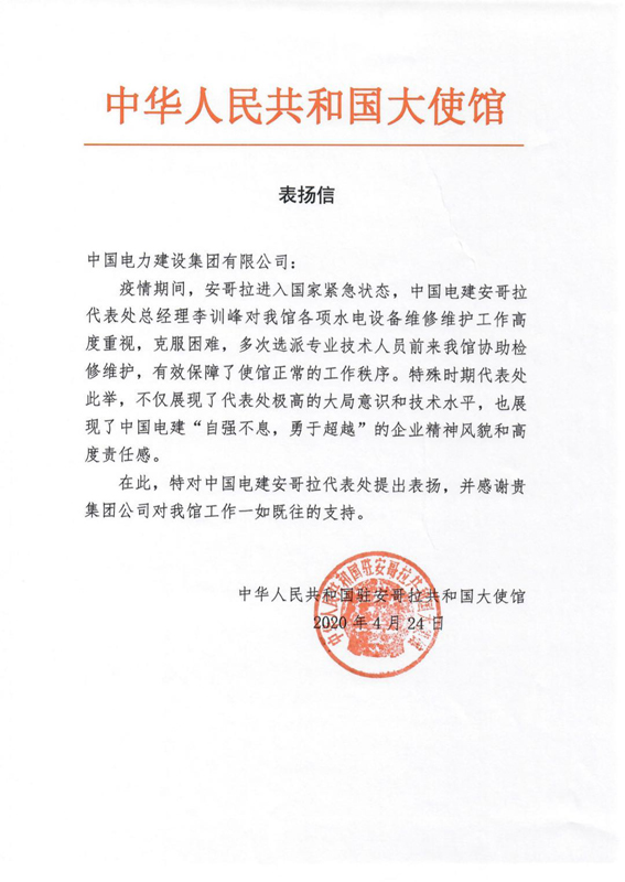 當?shù)貢r間4月24日,中國電建安哥拉代表處收到來自中國駐安哥拉大使館的表揚信,信中高度贊揚了中國電建安哥拉代表處在安哥拉進入國家緊急狀態(tài)的疫情期間,克服困難,對使館各項水電設備維修維護工作高度重視,多次選派專業(yè)技術人員前往使館協(xié)助檢修維護,為使館在疫情期間的正常秩序提供了有效保障。表揚信對中國電建“自強不息,勇于超越”的企業(yè)精神風貌和社會責任感給予了肯定,并感謝中國電建對使館工作一如既往的支持。